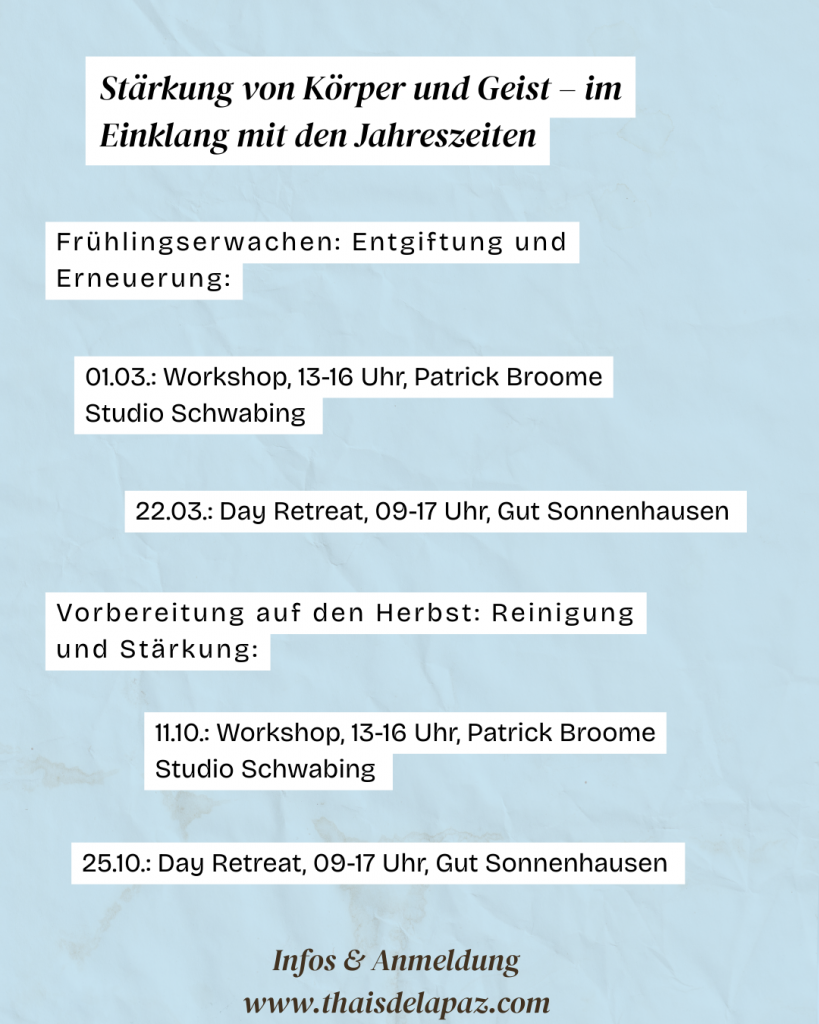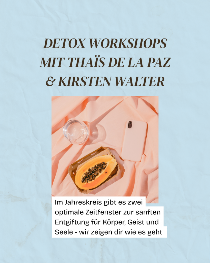 Thaïs und Kirsten Walter ( https://praxis-kirstenwalter.de/kirsten/ ) laden euch ein im Rahmen eines Workshops im angenehmen Patrick Broome Studio Schwabing euch mit dem wichtigen Thema Entgiftung sowohl körperlich wie auch praktisch umsetzbar auseinandersetzen. Es gibt zwei zeitliche Fenster im Jahresverlauf, die sich zur Entgiftung eigenen: der Frühling und der Herbst.
